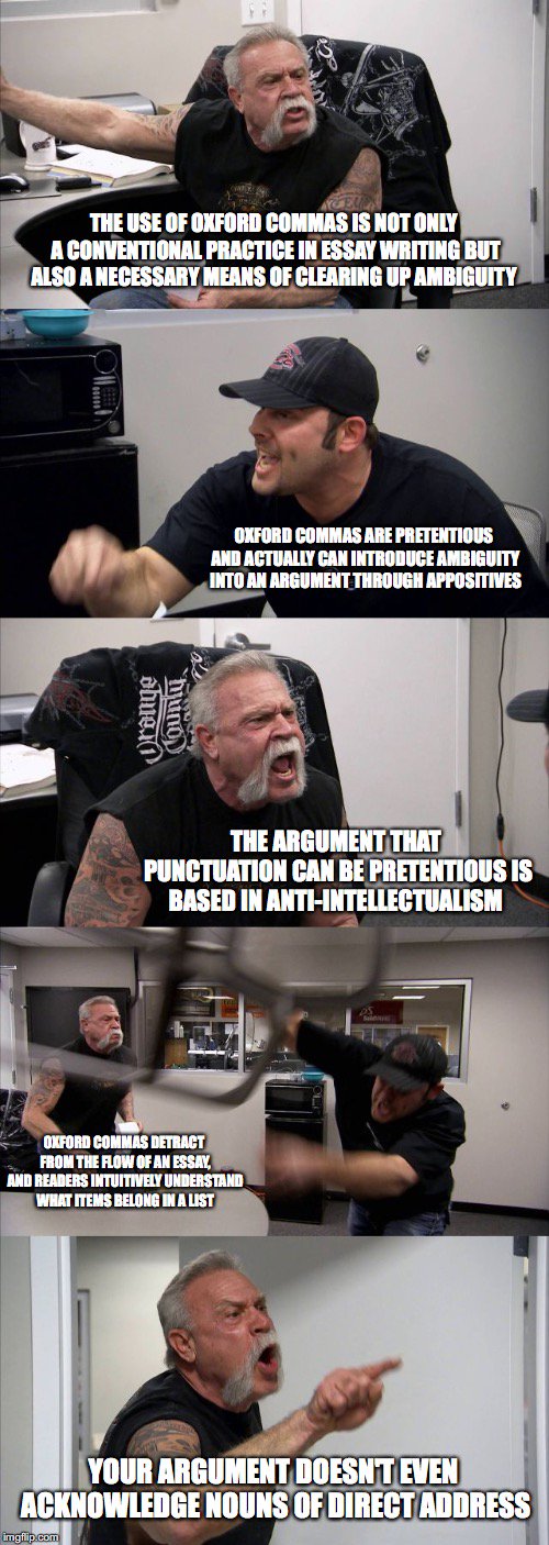 Anti oxford comma meme. Add an external link to your content for free. Anti Oxford Comma Meme Anyone Else Use The Oxford Comma I Use It As An American Meme Mostly Oxford Comma Memes Trending On Imgur The Oxford Comma Unnecessary Pretentious And Confusing The A Fort Made Of Books Why Your Oxford Comma Is A Waste Of Ink I Don. Some people consider the Oxford Comma stylistic which means its not really required.
