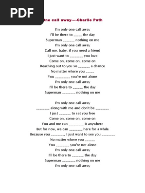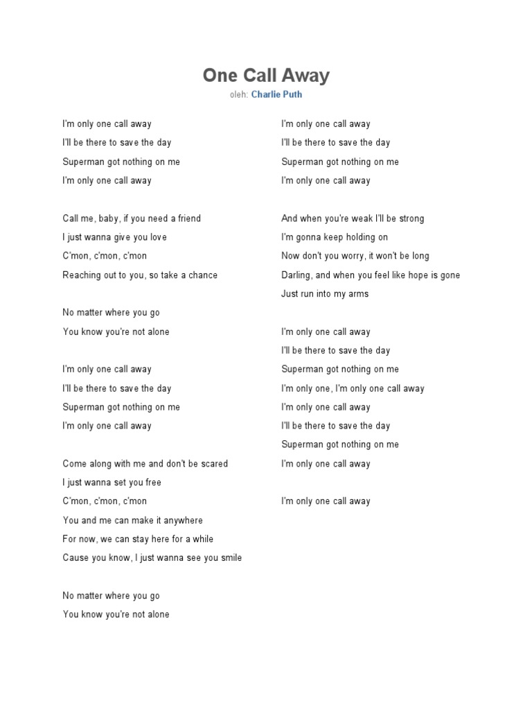Ajay Im Only One Call Away Ill Be There To Save The Day Superman Got Nothing On Me Im Only One Call Away Call Me Baby If You Need A Friend I Just Wanna Give You Love Cmon Cmon Cmon Reaching. The Lyrics for One Call Away by Charlie Puth have been translated into 51 languages. One Call Away Songtext. This is the end of Can You Call Me Baby Can You Be My Friend Lyrics. Ajay Im Only One Call Away Ill Be There To Save The Day Superman Got Nothing On Me Im Only One Call Away Call Me Baby If You Need A Friend I Just Wanna Give You Love Cmon Cmon Cmon Reaching. If you need a friend dont be afraid to call me up again. Stream Call Me Baby If You Need A Fool by elephantmoon from desktop or your mobile device. Im only one call away Call me baby if you need a friend I just wanna give you love Cmon cmon cmon Reaching out to you so take a chance No matter where you go. Youve Got a Friend.