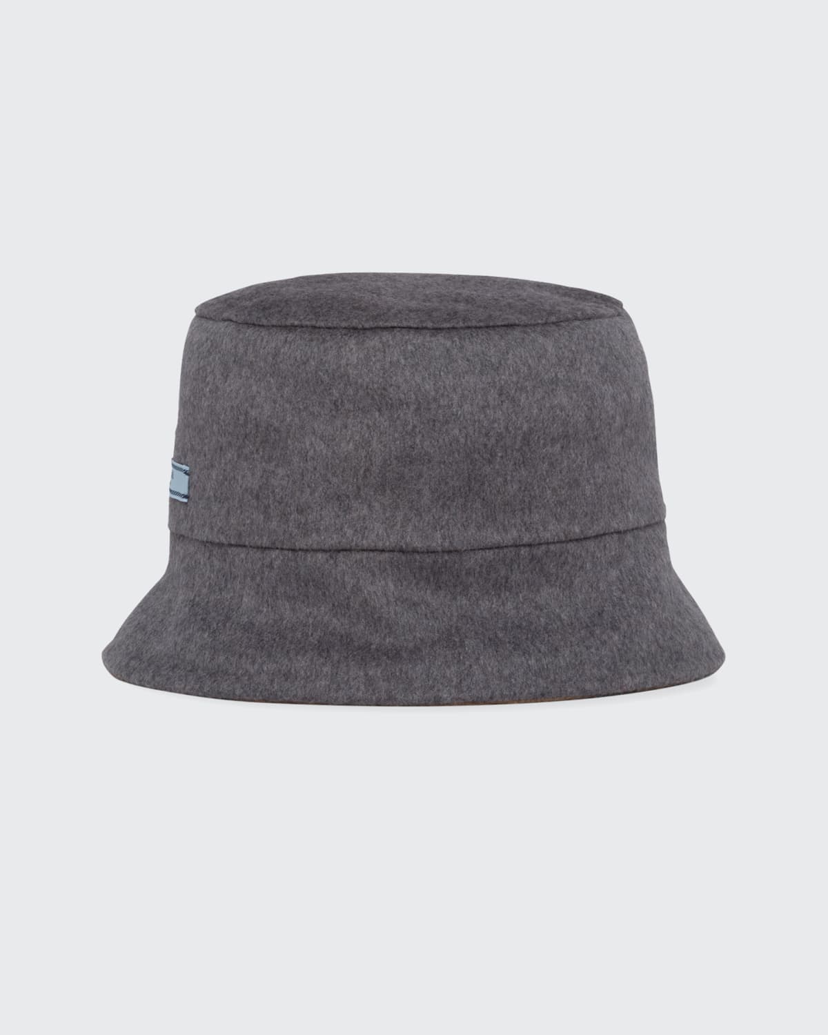 Ends on March the 9th at 1100 AM CET TDF SALE Up to 60 off FW21 Up to 70 off previous seasons. SEAMLESS CASHMERE BUCKET HAT WITH TRIOMPHE EMBROIDERY DETAILS COLOUR. Grey and camel cashmere bucket hat by Prada featuring logo patch.